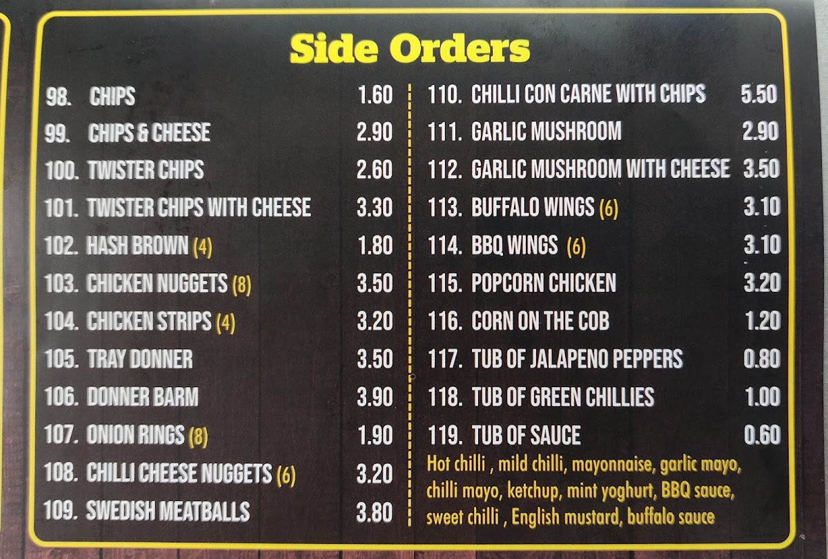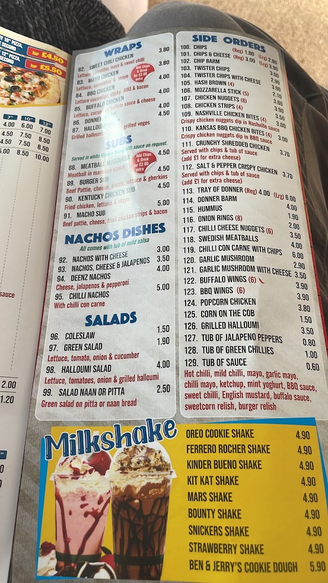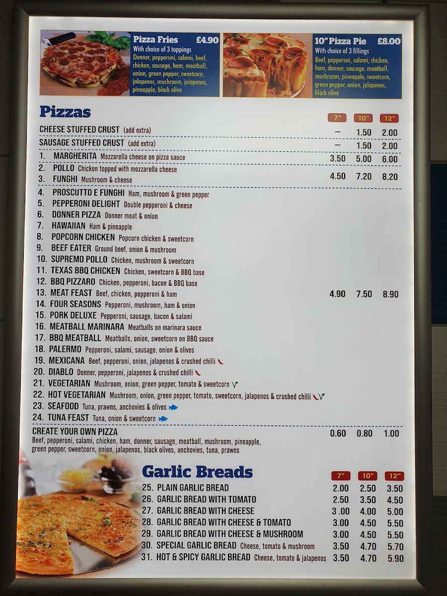 Extra toppings (+90p): bbq chicken, chicken tikka, pepperoni, spicy beef, chicken, ham, Donner meat, chicken tandoori, prawn, tuna, anchovies. Extra toppings (+70p): onions, mushrooms, sweet corn, mixed peppers, black olives, pineapple, jalepenos, crushed chillies, fresh tomatoes